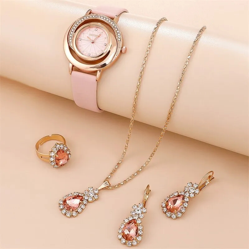 Subtelny zestaw damskiej biżuterii utrzymany w kolorze pudrowego różu ze złotymi zdobieniami.